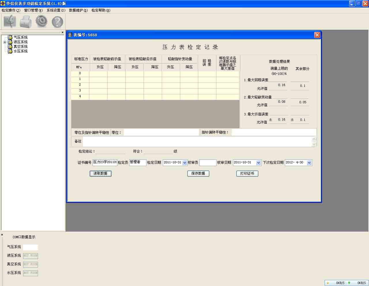 - V2008壓力自動檢定管理軟件是智能壓力校驗臺和壓力校驗儀系列的配套軟件,具有數(shù)據(jù)存儲、結果判定、數(shù)據(jù)查詢、信息管理、記錄和證書打印等功能,省去了手工記錄帶來的繁瑣工作,避免了人為誤差,有效的提高了計量檢定工作的效率和數(shù)據(jù)的準確性。