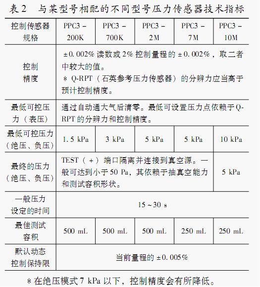 現(xiàn)在許多數(shù)字壓力計(jì)都帶有自動(dòng)控制功能,其控制原理、控制方式、控制計(jì)量性能是有很大差別的,其控制技術(shù)指標(biāo)對(duì)測(cè)量結(jié)果的影響應(yīng)引起大家的注意。在使用數(shù)字壓力控制器(帶壓力自動(dòng)控制功能的數(shù)字壓力計(jì))量傳時(shí)應(yīng)分析其自動(dòng)控制性能、技術(shù)指標(biāo)對(duì)測(cè)量結(jié)果的影響。表2是與某公司生產(chǎn)的某一系列數(shù)字壓力控制器相配的不同型號(hào)壓力控制傳感器技術(shù)指標(biāo)[2],其中有些指標(biāo)在分析評(píng)定不確定度時(shí)必須要考慮的,如默認(rèn)動(dòng)態(tài)控制保持限:當(dāng)前量程的±0.005%。這一保持限是可以改變的,改變范圍受其自身控制能力限制,不能無限降低。