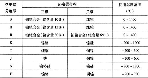 常用熱電偶可分為標(biāo)準(zhǔn)系列熱電偶和非標(biāo)準(zhǔn)系列熱電偶兩大類。所謂標(biāo)準(zhǔn)系列熱電偶是指國家標(biāo)準(zhǔn)規(guī)定了其熱電勢與溫度的關(guān)系、最大允許誤差,并有統(tǒng)一的標(biāo)準(zhǔn)分度表的熱電偶。非標(biāo)準(zhǔn)化系列熱電偶在使用范圍、數(shù)量上均不及標(biāo)準(zhǔn)化熱電偶,一般也沒有統(tǒng)一的分度表,主要用于某些特殊場合的測量。我國從1988年1月1日起,熱電偶全部按IEC國際標(biāo)準(zhǔn)生產(chǎn),并指定S、B、E、K、R、J、T、N 8種標(biāo)準(zhǔn)化熱電偶為我國統(tǒng)一設(shè)計型熱電偶。標(biāo)準(zhǔn)系列熱電偶如表1所示。