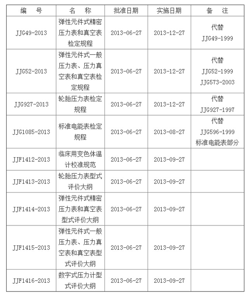 根據(jù)《中華人民共和國(guó)計(jì)量法》有關(guān)規(guī)定,國(guó)家質(zhì)量監(jiān)督檢驗(yàn)檢疫總局批準(zhǔn)JJG49-2013《彈性元件式精密壓力表和真空表》等9個(gè)國(guó)家計(jì)量技術(shù)法規(guī)發(fā)布實(shí)施。