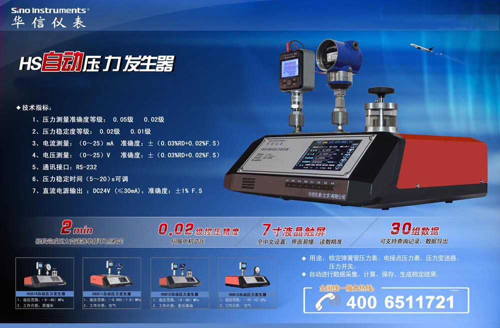華信儀表HS自動(dòng)壓力發(fā)生器系列產(chǎn)品由多名工程師經(jīng)過(guò)數(shù)月技術(shù)攻關(guān)研發(fā)而成,具有伺服電機(jī)控壓技術(shù),真正達(dá)到了0.01%F.S的控壓穩(wěn)定度和操作自動(dòng)化。7寸真彩觸摸屏一觸即“現(xiàn)”,簡(jiǎn)便直觀的操作直接提升了檢定效率。