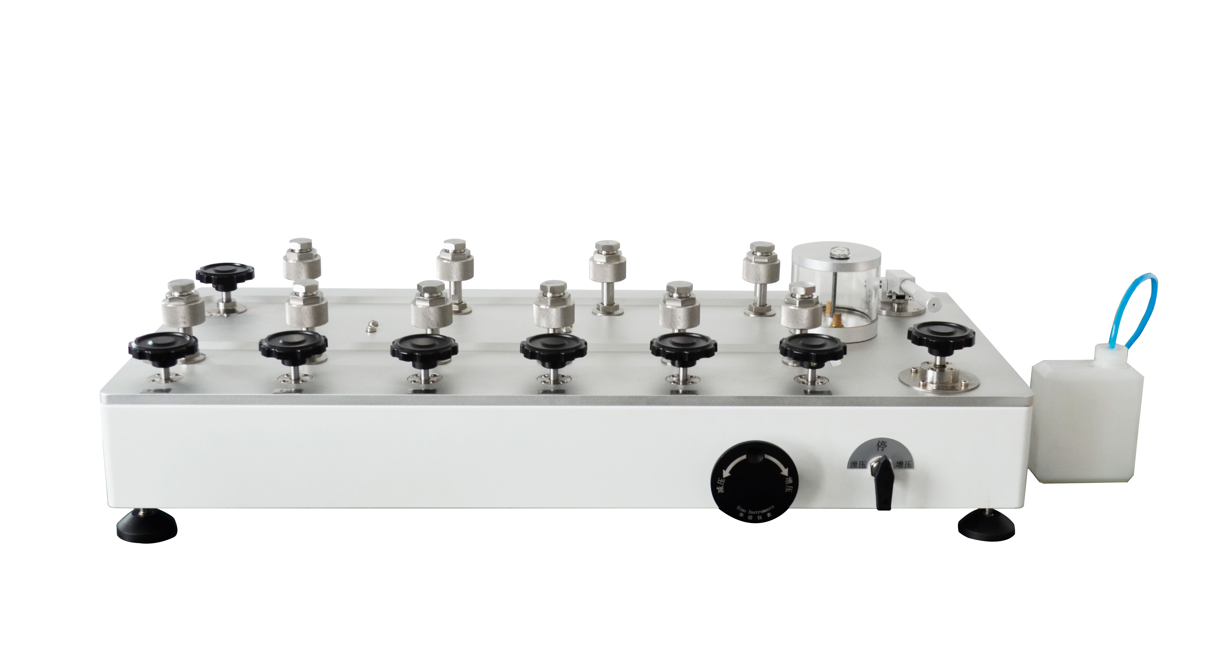 針對計量單位6MPa以下大批量液壓壓力表的檢定需求,量身定制!一次可同時檢定9塊YB-100或6塊YB-150壓力表,且適合不同量程同時檢定!